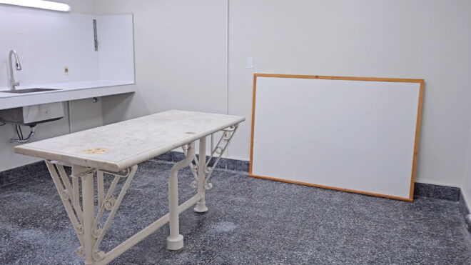 Para ello se han efectuado diferentes obras de adecuación de dicho espacio que consiste de dos salas, una el salón para impartir las clases de Anatomía y un segundo salón donde se preparan los materiales y oficia de almacenamiento. Parte de los materiales de trabajo ya se han dispuesto en este espacio.