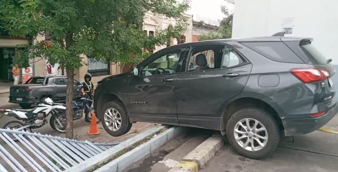 Una camioneta derribó la baranda de contención y quedó literalmente con las dos ruedas delanteras hacia la vereda que da a la calle Soca.