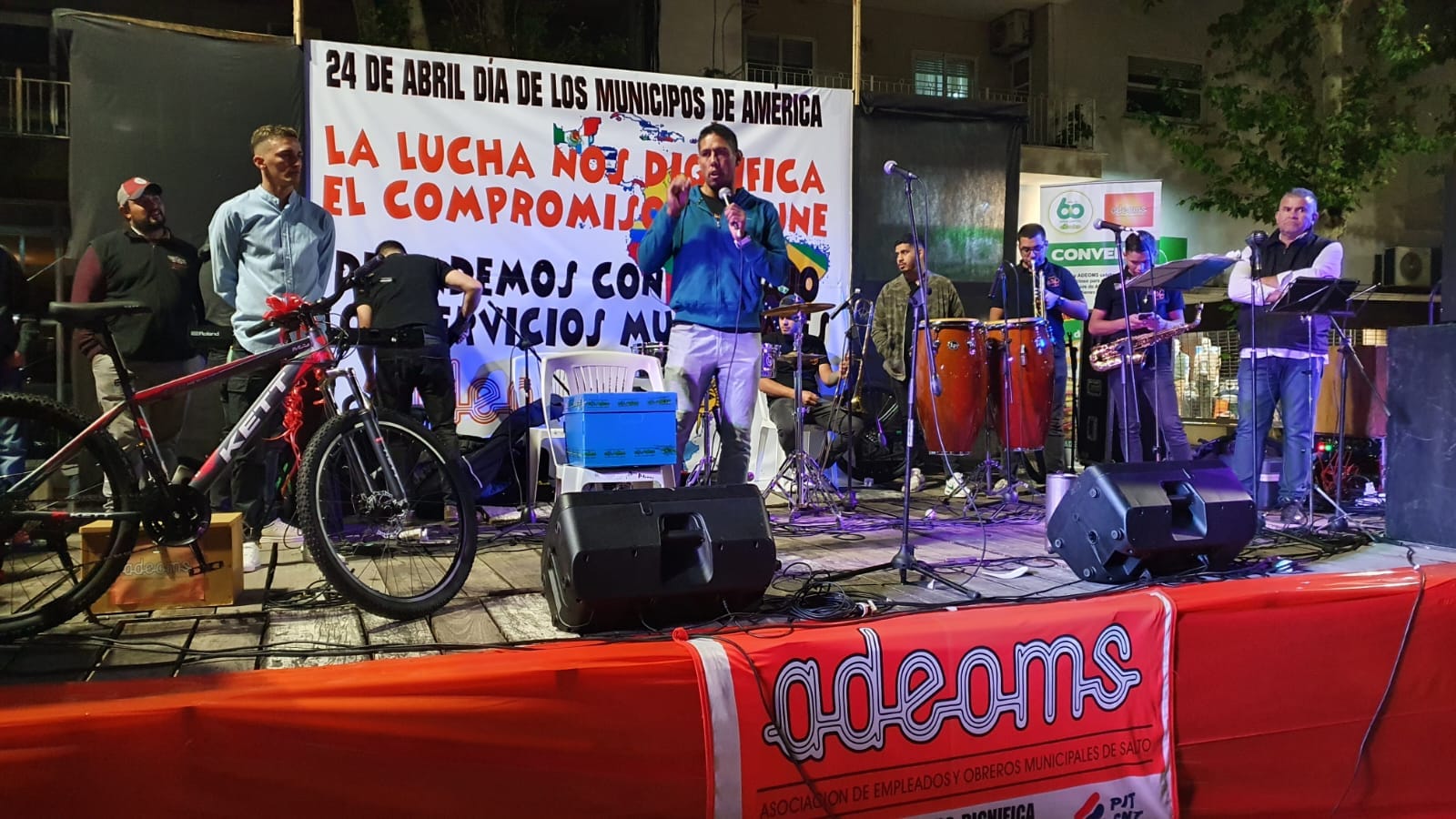 Con un importante marco de público, que colmó la Plaza Artigas el pasado sábado 23 de abril, con la finalidad de participar del acto por el Día de los Municipios de América y que oficia de fecha conmemorativa para los funcionarios de las Intendencias de todo el país, el presidente de ADEOMS, Juan Carlos Gómez, agradeció a los trabajadores municipales en su día por la labor que realizan cada día, destacando que «son los que dan la cara en nombre de la administración saliendo a las calles, como los compañeros de Recolección, del servicio de Ómnibus, de las Termas, los administrativos, los de Obras, los de los Municipios en el interior, entre otros».