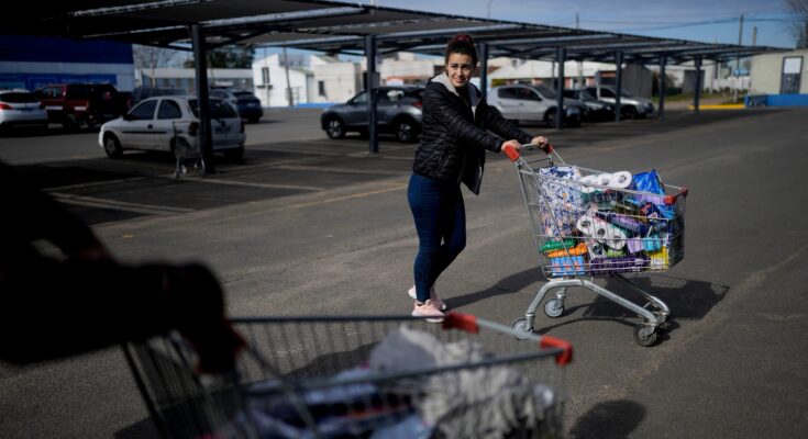 La uruguaya Diana Rocco va a su auto con el carrito lleno después de realizar sus compras en un supermercado de Gualeguaychú, provincia de Entre Ríos, Argentina. (AP Foto/Natacha Pisarenko)