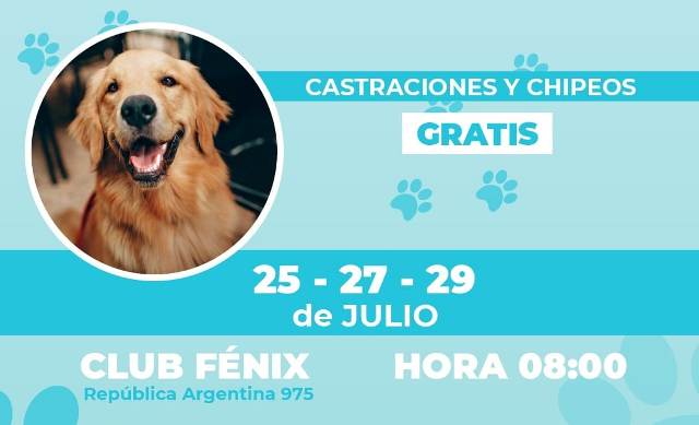 Los días 25, 27 y 29 de julio se realizarán castraciones gratuitas y colocación de chips en el Club Fénix, a partir de la hora 8.00.