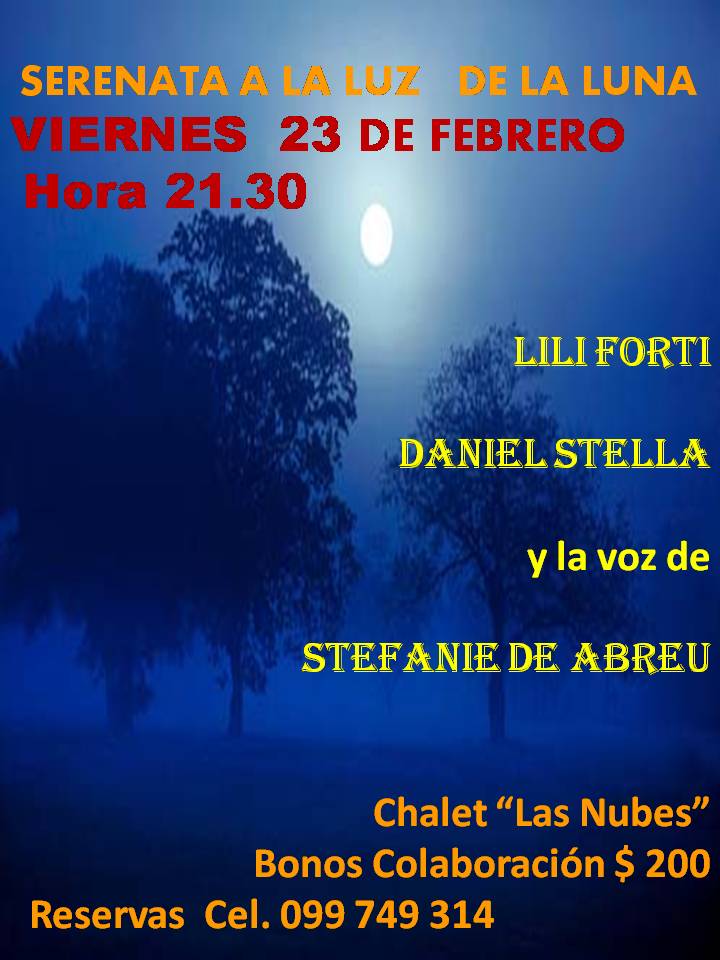 Para el día viernes 23 de Febrero a la hora 21.20, la Asociación Amigos de “Las Nubes” está anunciando un concierto a dos pianos a cargo de Liliana Forti y Daniel Stella bajo el nombre Serenata a la luz de la luna.