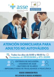 Atención domiciliaria de la Red Atención Primaria de ASSE, para mayores de 18 años, no autoválidos. No es atención urgencia ni emergencia. Se debe coordinar.