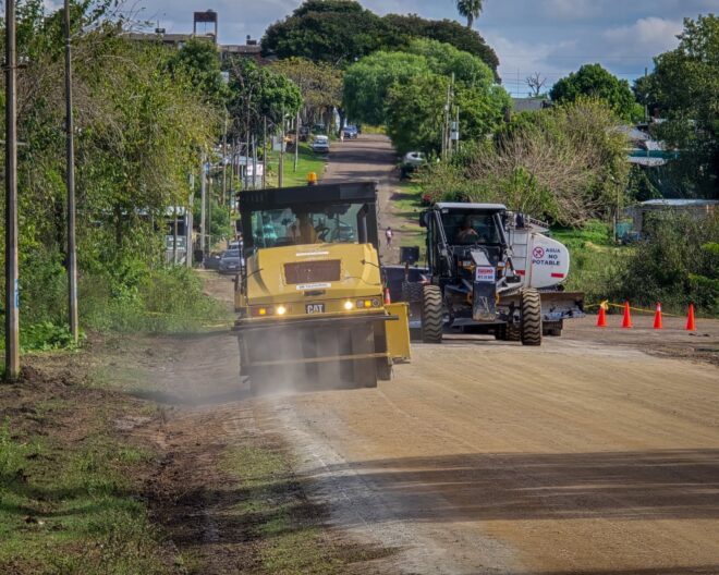 Actualmente, la empresa Bisio lleva adelante tareas de estabilización y cementado de la calzada, una etapa clave para garantizar mayor durabilidad y mejores condiciones de circulación.