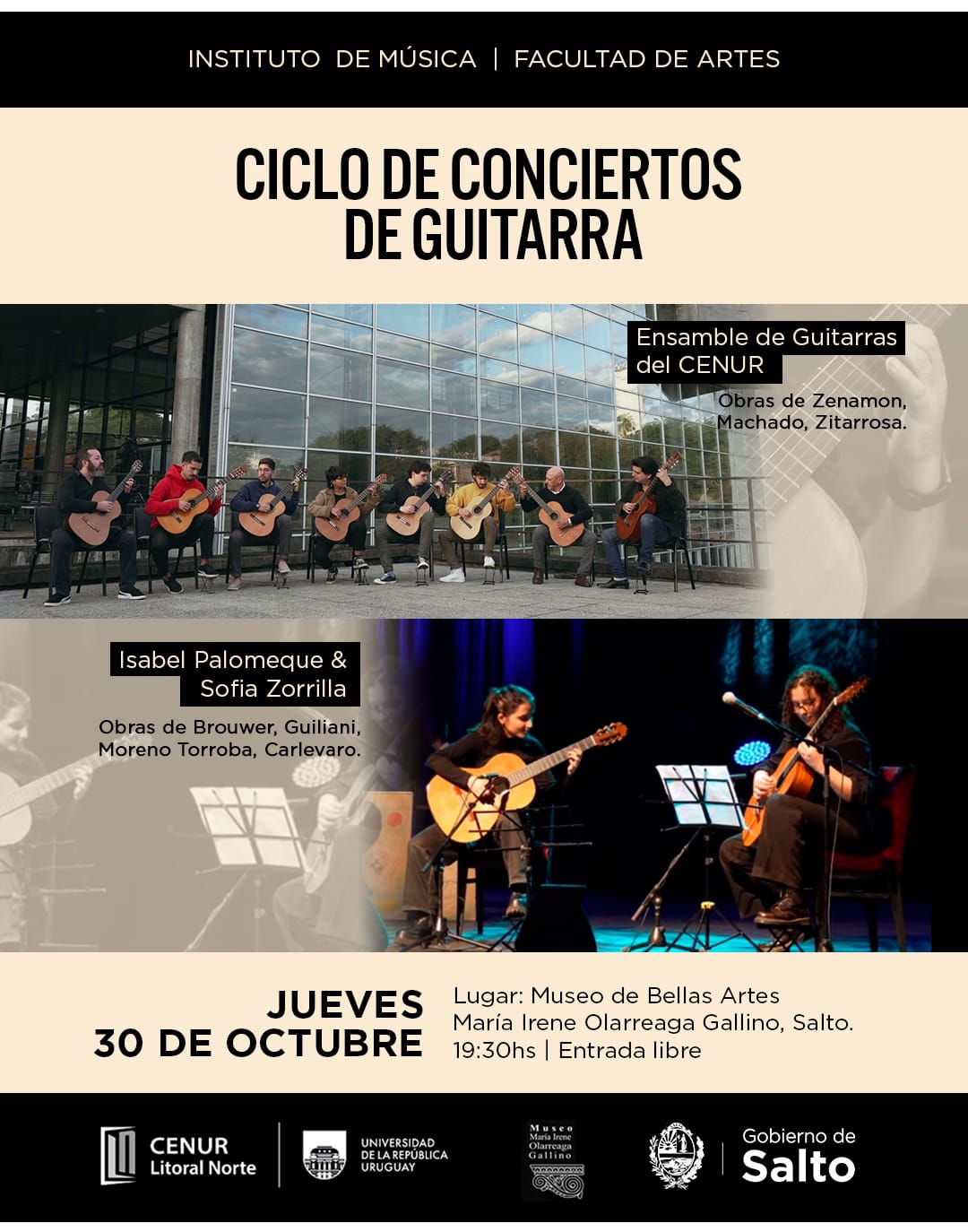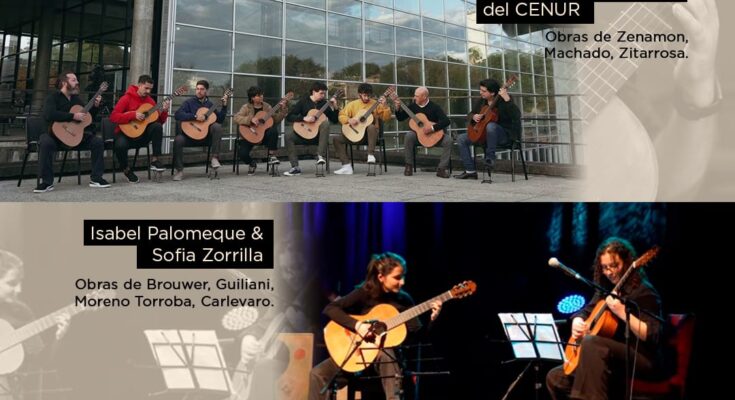 En esta oportunidad, se presentará el Ensamble de Guitarras del CENUR, interpretando obras de Zenamon, Machado y Zitarrosa, seguido del duo conformado por Isabel Palomeque y Sofía Zorrilla, quienes tocarán piezas de Brouwer, Giuliani, Moreno Torroba y Carlevaro.