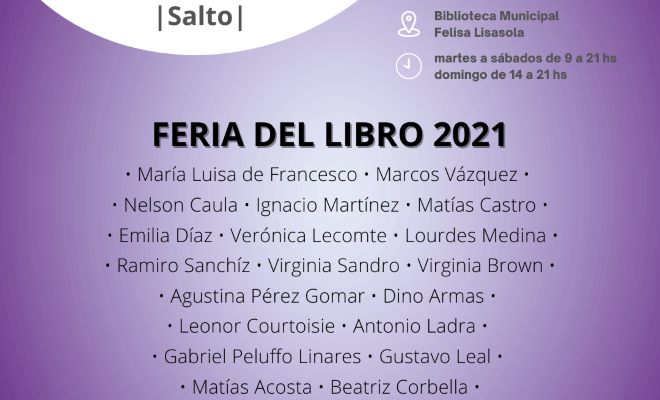 Durante toda la semana concurrirán a Salto reconocidos escritores y editores, incluyendo seis premios nacionales de literatura. Marcos Vázquez, Virgina Sandro, Ignacio Martínez, Matías Castro, Emilia Díaz, Verónica Lecomte, Lourdes Medina, Nelson Caula, Ramiro Sanchíz, Virgina Brown, Agustina Pérez Gomar, Dino Armas, Leonor Courtoisie, Antonio Ladra, Gabriel Peluffo Linares, Gustavo Leal, Matías Acosta y Beatriz Corbella formarán parte de la propuesta de la feria.