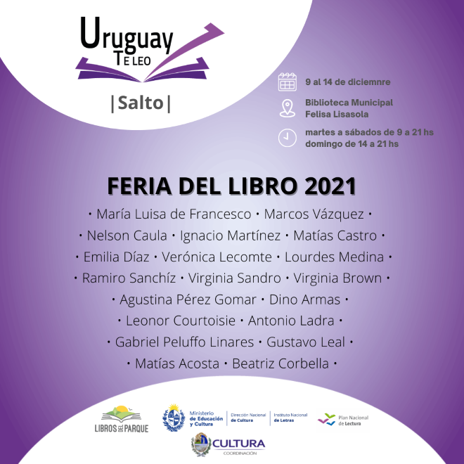 Del 9 al 14 de noviembre, en la biblioteca Felisa Lisasola (Artigas esquina 25 de Agosto) y en una carpa ubicada en la plaza Artigas, se desarrollará la feria del libro «Uruguay Te Leo», con un programa muy completo de actividades, charlas, talleres y presentaciones de libros.