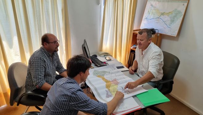 En las últimas horas se llevó a cabo una reunión de coordinación entre el director de Descentralización de la Comuna, Álvaro Gómez, el jefe de Vialidad del Departamento de Obras, Manuel de Souza y el integrante del equipo de Promoción y Desarrollo, Ing. Leonardo Verme.