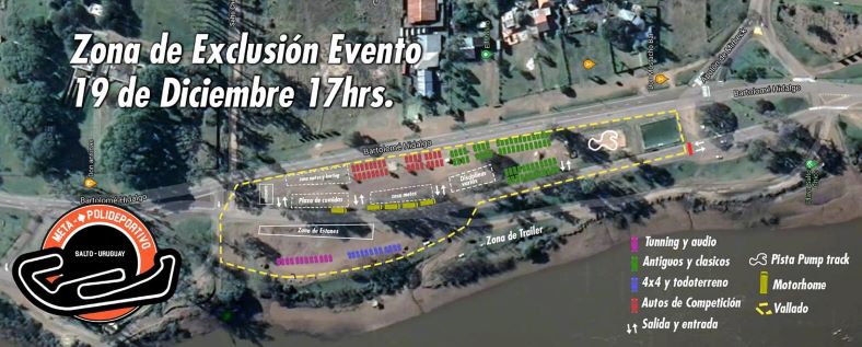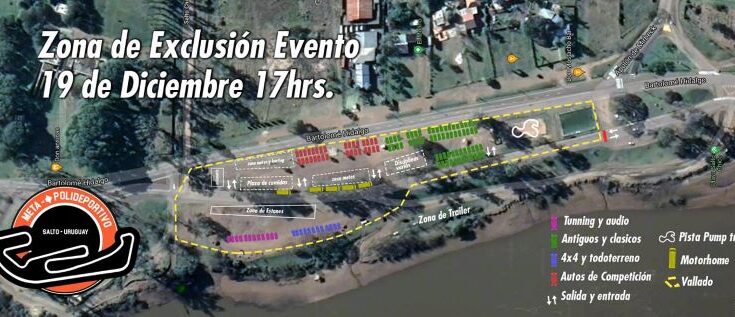 El departamento de Movilidad Urbana de la Intendencia de Salto informa que este domingo 19 de diciembre, de 14:30 a 00:00 horas, la Costanera Norte Bartolomé Hidalgo, contra el río Uruguay, entre Ramón Vinci (ex Apolón) y Salto Chico, permanecerá cerrada al tránsito vehicular debido a la realización de un evento de exhibición organizado por Grupo Meta (habrá zona de exclusión).