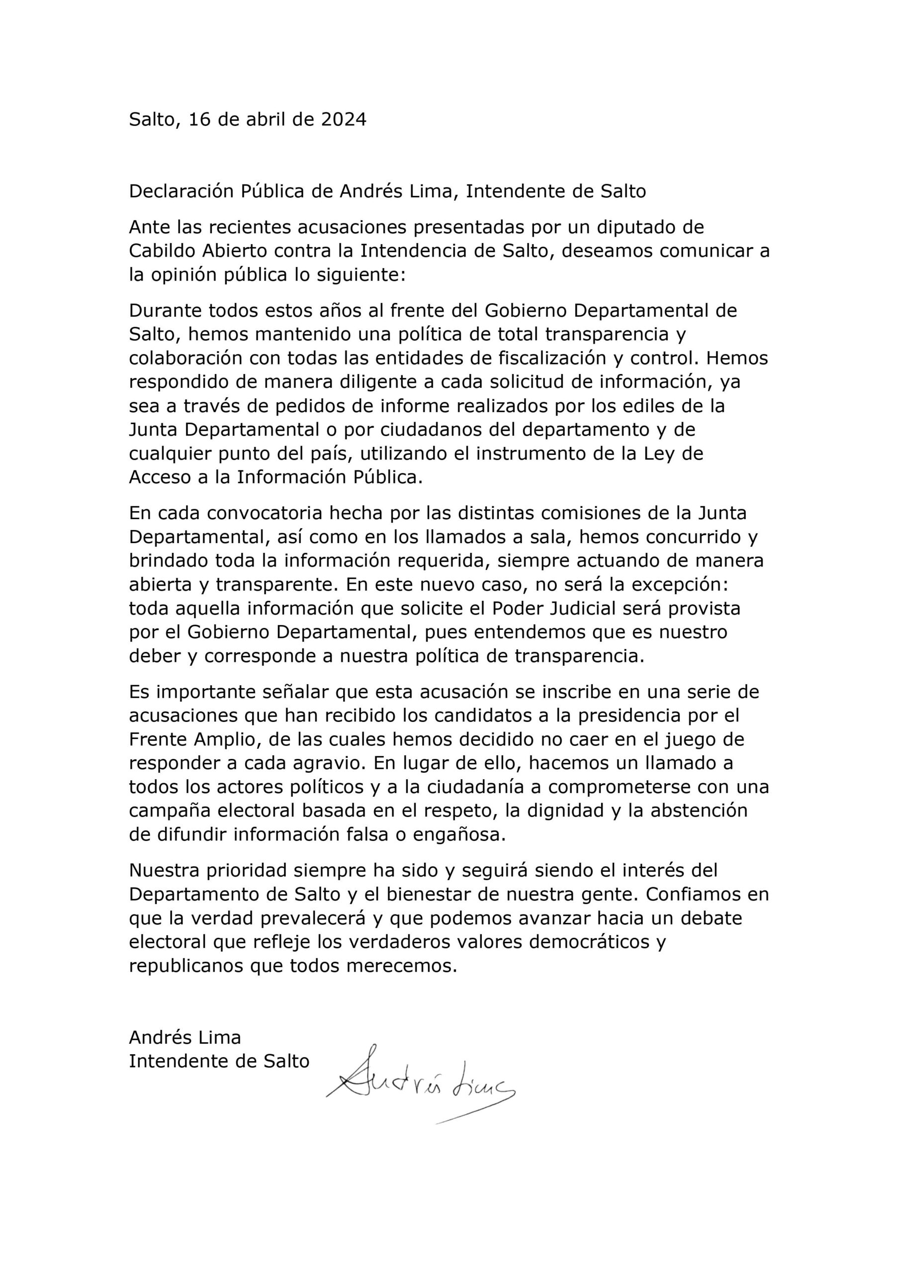 Declaración Pública de Andrés Lima, Intendente de Salto