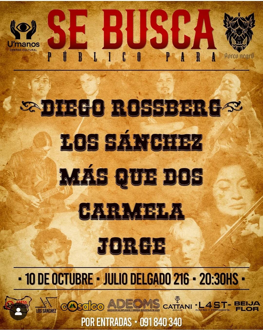 Estamos invitando y comunicando que quedan pocas entradas. El evento contará con una apertura a cargo de artistas locales: Jorge, Carmela; y Más que Dos, quienes provienen de Artigas. Luego será el turno de Los Sánchez, para dar paso al gran cierre a cargo de Diego Rossberg, quien se presentará en formato banda acompañado por Los Sánchez, informó Facundo Sánchez.