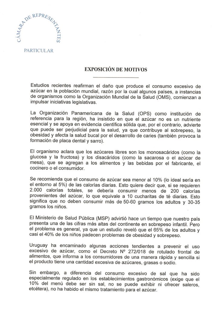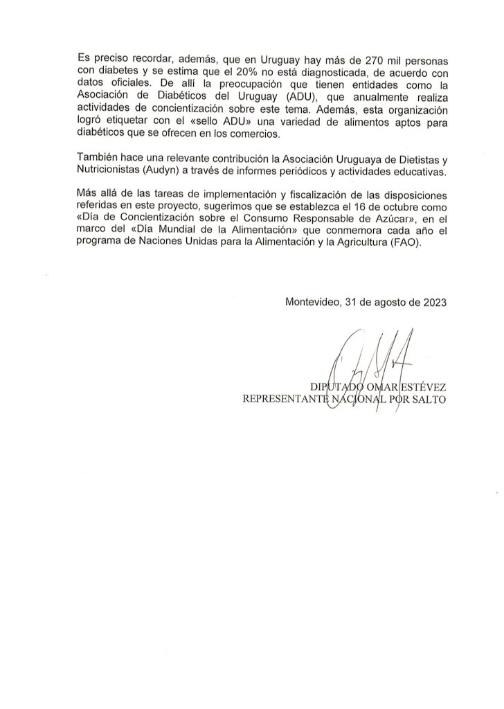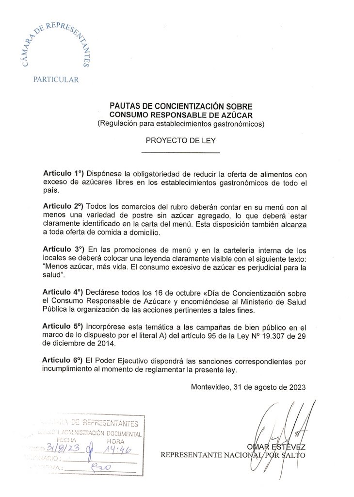 Días pasados, el diputado por Salto del Partido Colorado, Omar Estévez, presentó un proyecto de ley sobre pautas de concientización sobre consumo responsable de azúcar en establecimientos gastronómicos.