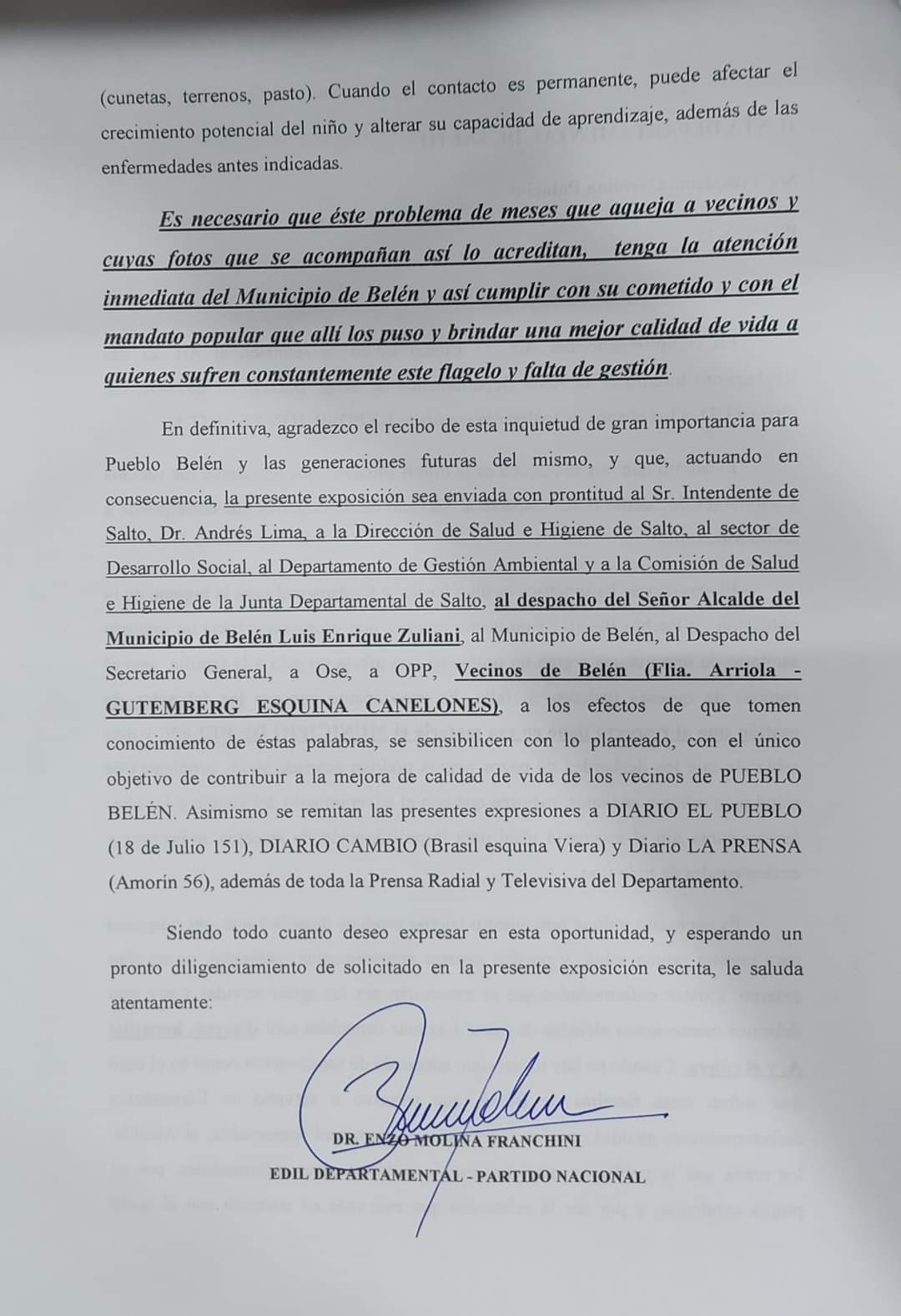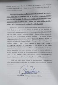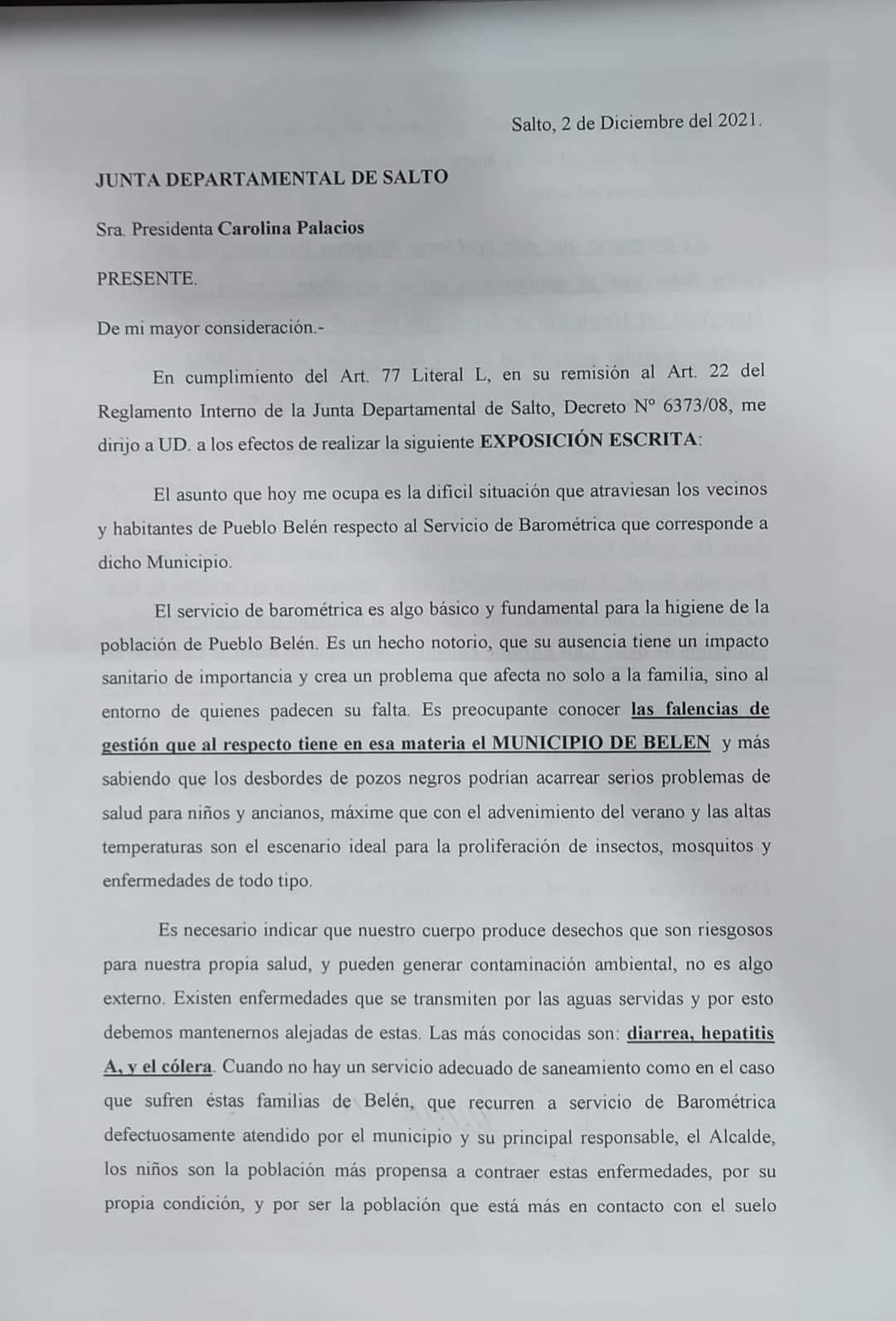 En la pasada 22° Sesión Ordinaria, Acta N° 42 de la Junta Departamental de Salto presentamos una exposición escrita referente a la difícil situación de un sinnúmero de Familias de Pueblo Belén a raíz de la falta de Gestión de ese Municipio al momento de gestionar y solucionar problemas con el servicio de Barometrica.