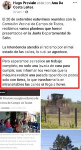 Desde la red social Facebook agradecíamos que atendieran el reclamo presentado en la Junta Departamental de Salto dónde expresábamos el sentimiento de los vecinos que reclamaban estar olvidados por el Gobierno Departamental, y adelantábamos lo que iba a suceder si el trabajo no se hacía correctamente cuando lloviera.