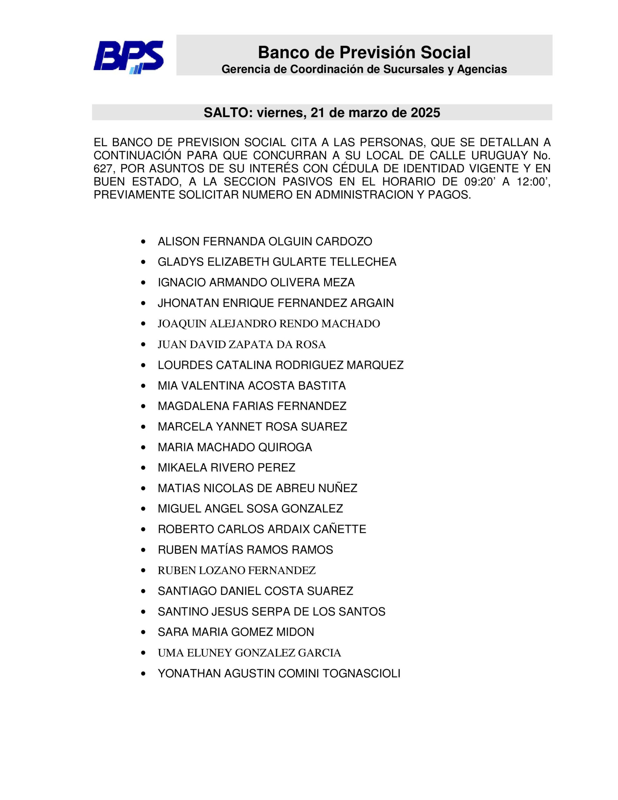 El Banco de Previsión Social – Sección Pasivos realiza citaciones