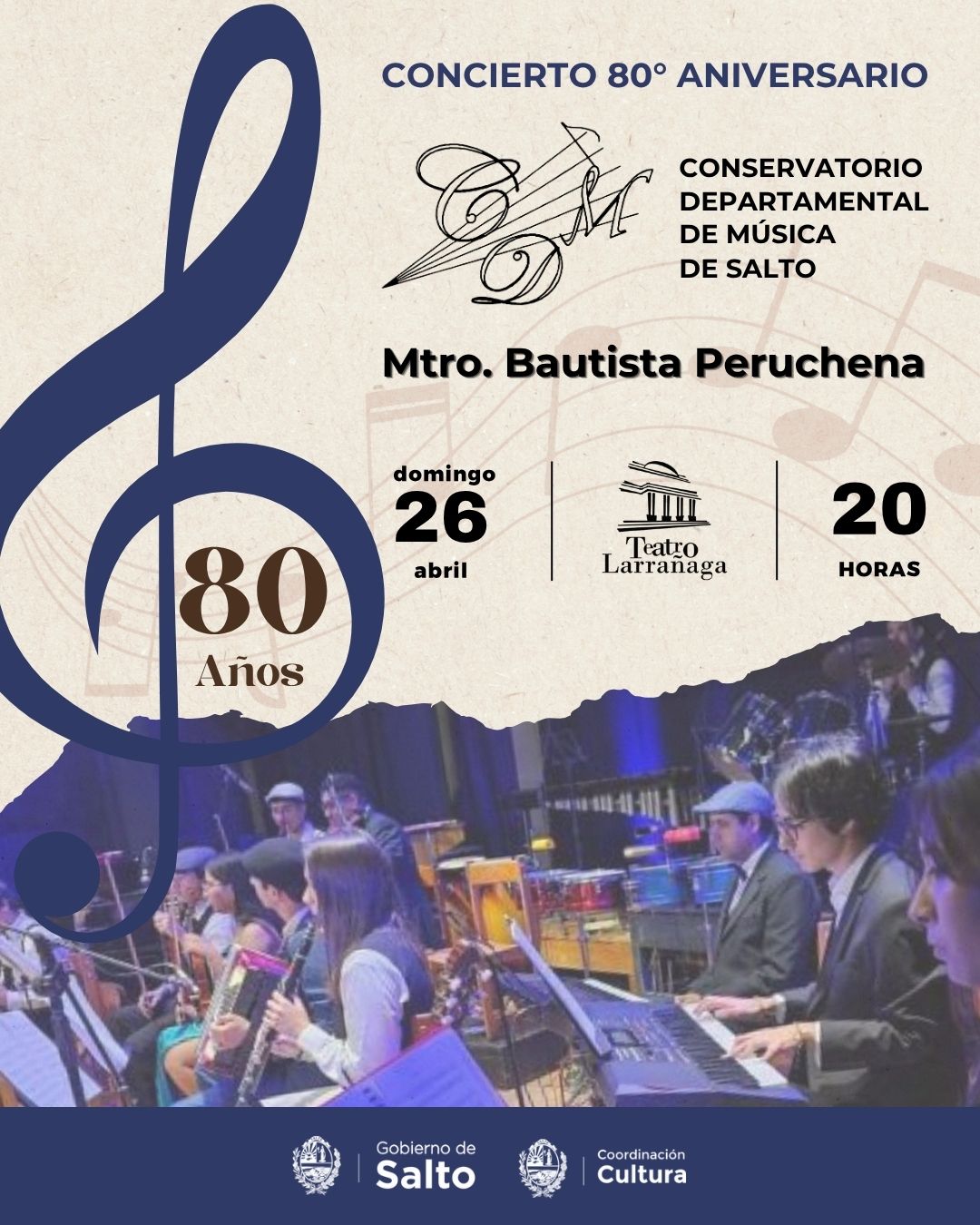 El Conservatorio Departamental de Música “Maestro Bautista Peruchena” de Salto celebrará su 80° aniversario con un concierto especial que tendrá lugar el domingo 26 de abril a las 20:00 horas en el Teatro Larrañaga.