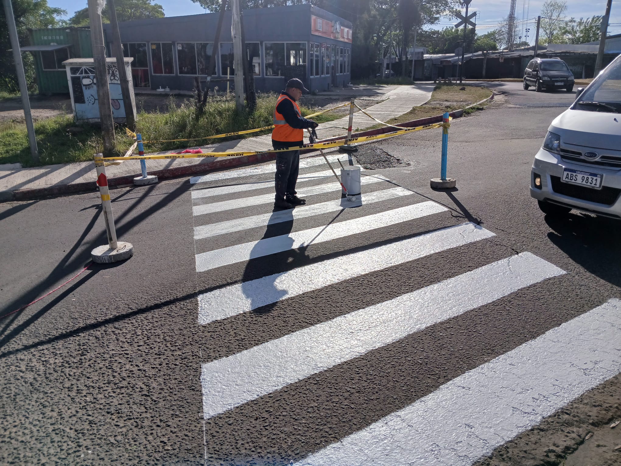 Las tareas incluyen la pintura y reacondicionamiento de sendas peatonales (cebras) y otras marcas viales en áreas de alto tránsito, priorizando aquellos sectores donde la circulación de personas y vehículos es más intensa.