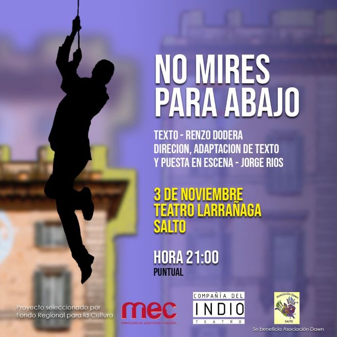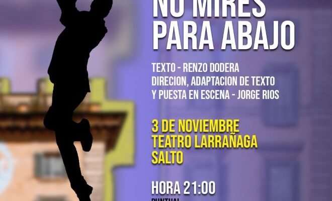Este miércoles 3 de noviembre a las 21 horas en el teatro Larrañaga se estará presentando la obra “No mires para abajo” con dirección, adaptación de texto y puesta en escena de Jorge Ríos. La actividad es a total beneficio de la Asociación Down de Salto. Por ello la invitación de Carolina Abogadro, integrante de la mencionada Asociación quien expresó “esperemos que el público salteño acompañe, apoye la causa y disfrute de un espectáculo con premios y reconocimiento a nivel nacional. Las entradas ya se están vendiendo en Himalaya 24 hrs y el mismo teatro”.