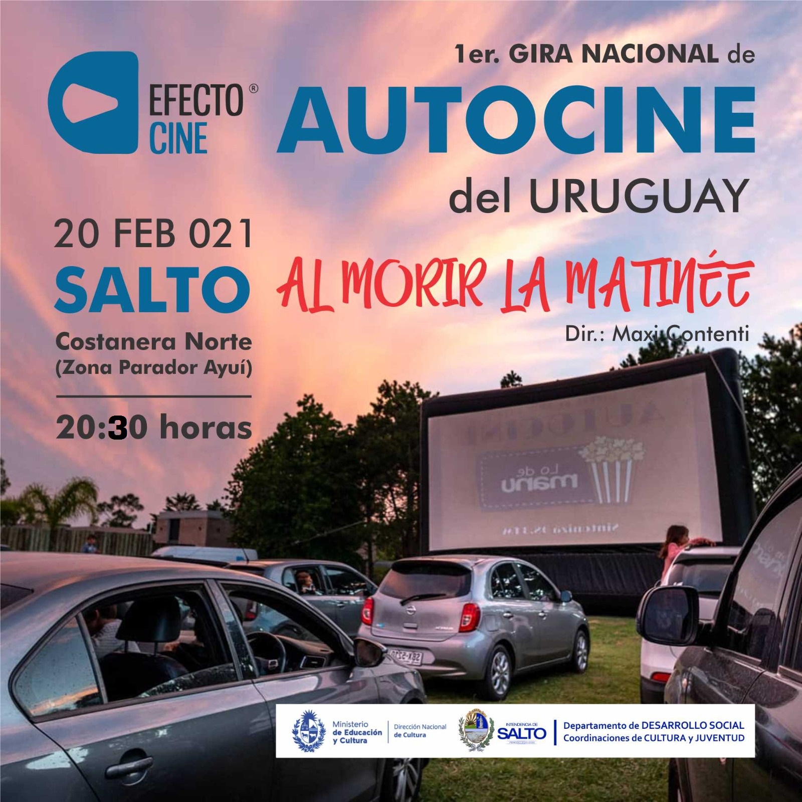 La Coordinaciones de Cultura y Juventud de la Intendencia de Salto, dependientes del Departamento de Desarrollo Social, invitan para este sábado 20 de febrero a partir de las 20.30 hrs., a la primera función en Salto de la gira nacional de Autocine.