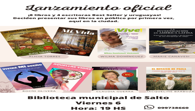Las escritoras uruguayas Marie Canavesi, Jaqueline Barboza, Wilma Domínguez, Claudia Guerra, Rocío Olivera y Alicia Torres invitan a la primera presentación pública de sus libros a realizarse en la ciudad de Salto.