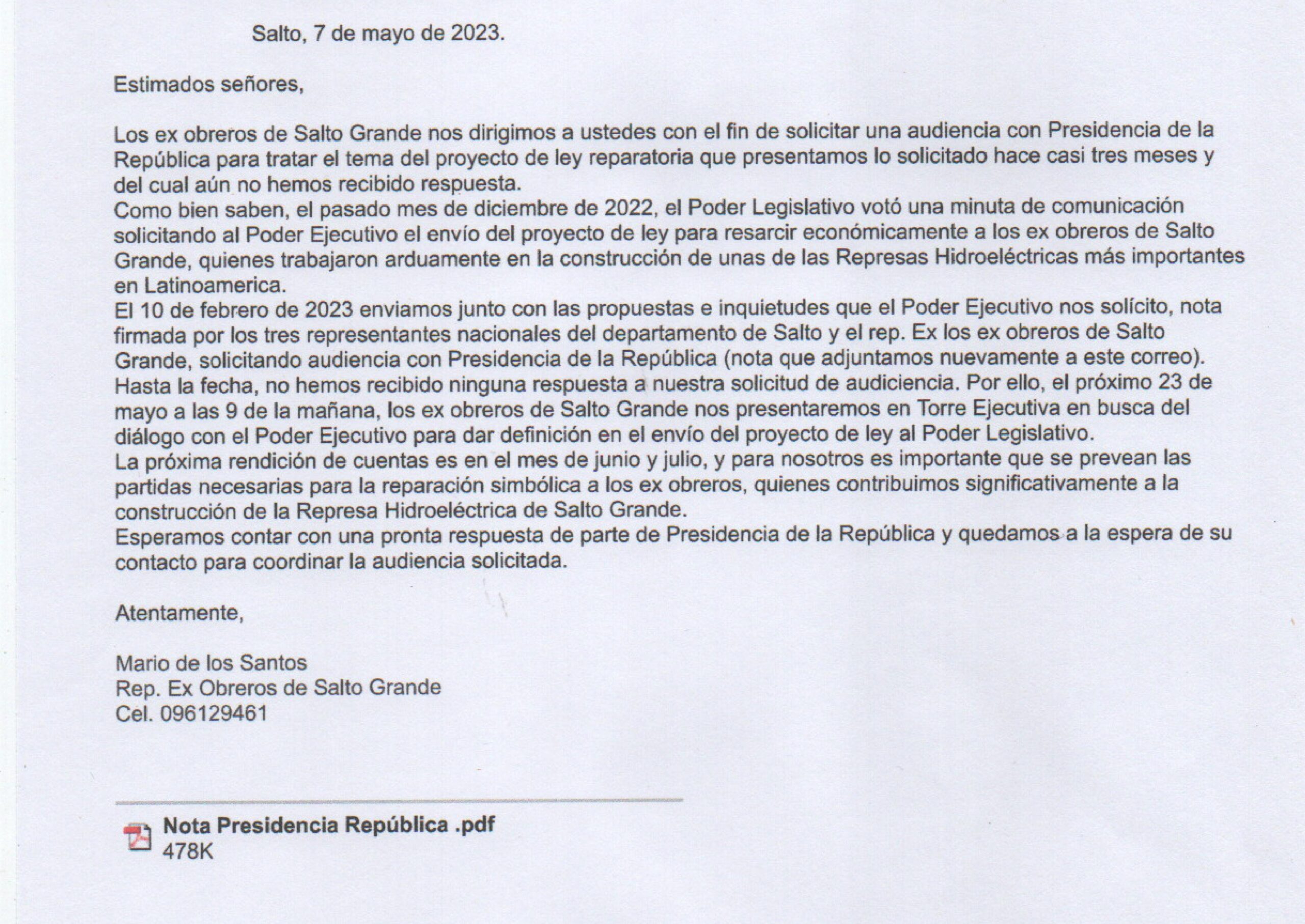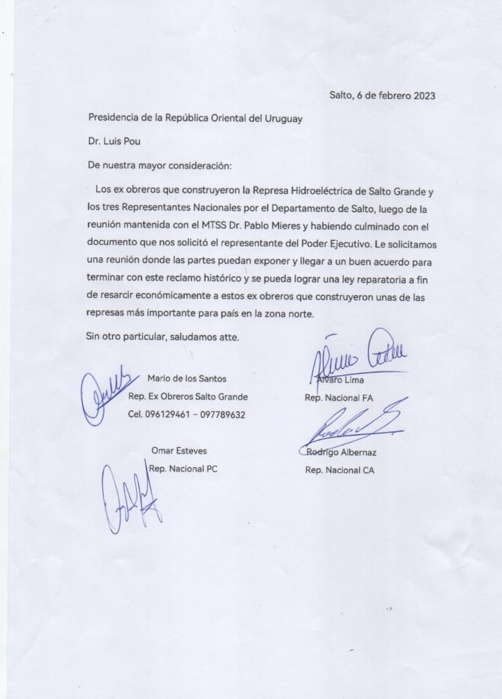 Ex obreros de Salto Grande enviaron una nueva carta a Presidencia solicitando una audiencia 8 mayo, 2023 - Dejar un comentario