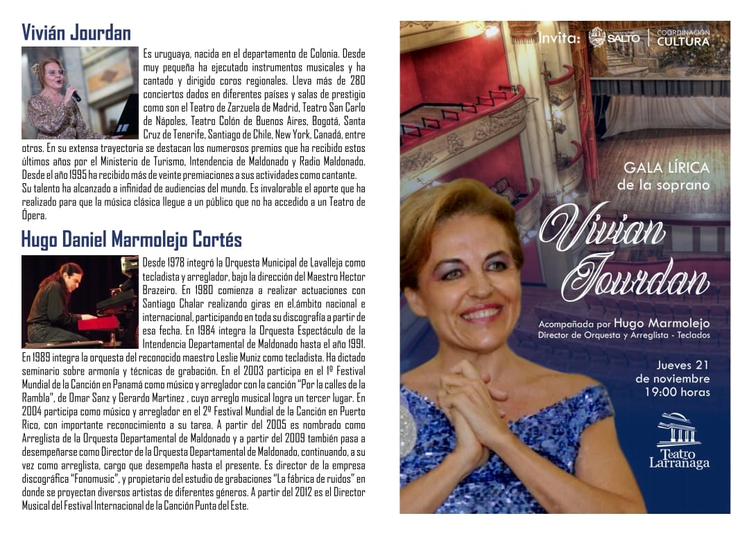 La Coordinación de Cultura de la Intendencia de Salto invita a disfrutar de una gala lírica imperdible, protagonizada por la reconocida soprano uruguaya Vivian Jourdan. El evento se realizará este jueves 21 de noviembre, a partir de las 19 horas, en el emblemático Teatro Larrañaga, con entrada libre y gratuita.