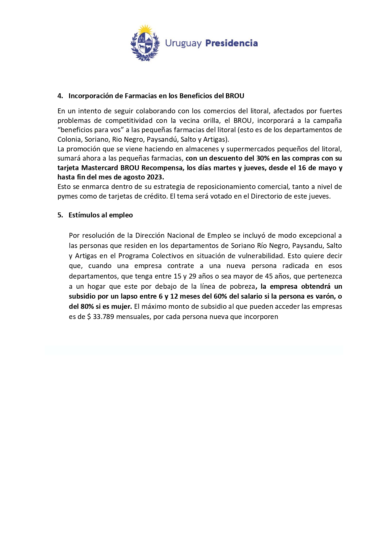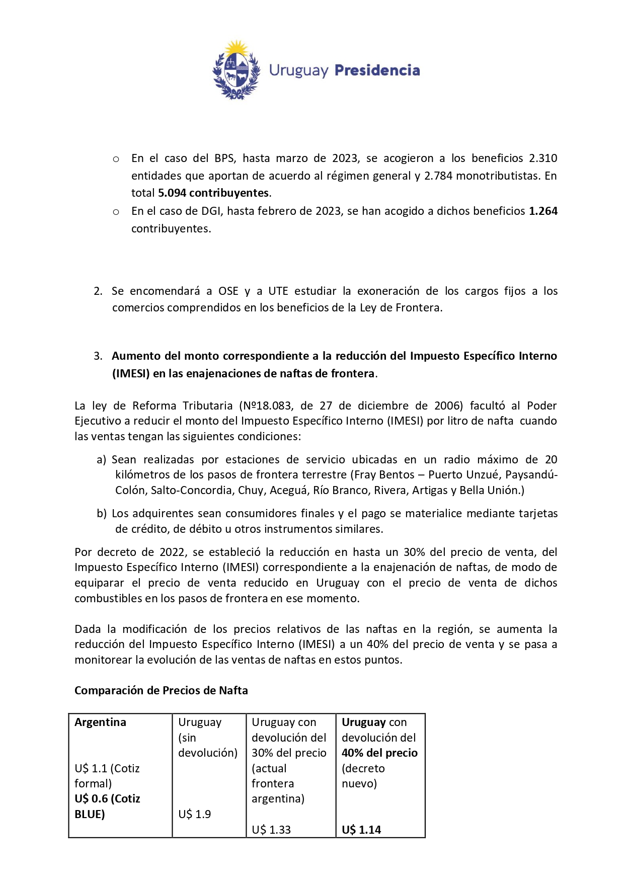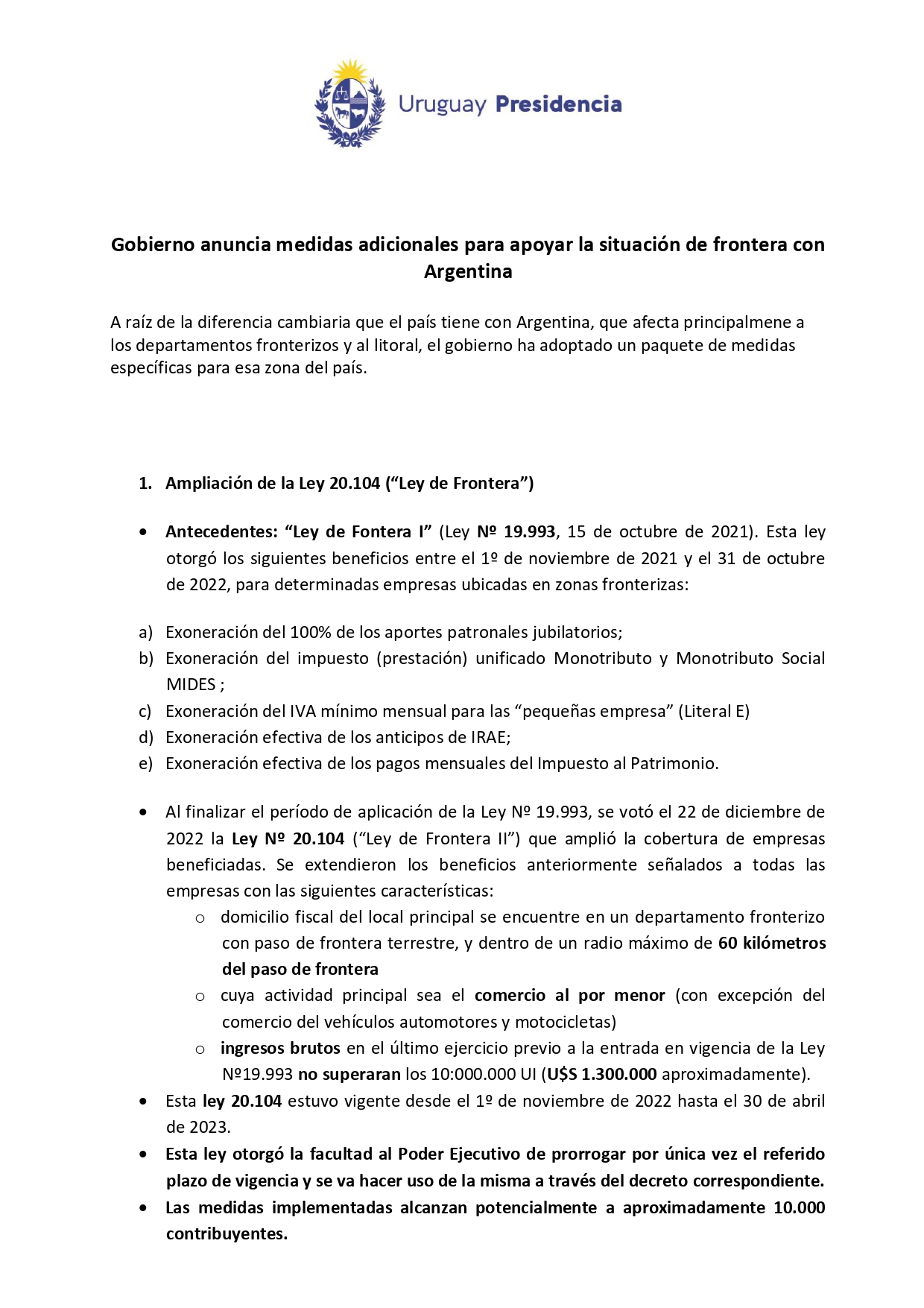 A raíz de la diferencia cambiaria que el país tiene con Argentina, que afecta principalmente a los departamentos fronterizos y al litoral, el Gobierno ha adoptado un paquete de medidas específicas para esa zona del país.