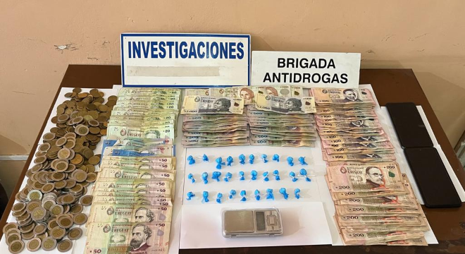 Un recipiente de plástico con tapa rosa que contenía 28 envoltorios de nylon color azul con sustancia blanca, una riñonera negra con un envoltorio de nylon color azul con sustancia blanca, una balanza de precisión, un celular, más de 43.000 (cuarenta y tres mil) pesos uruguayos en billetes y más de 2.000 (dos mil) en monedas, tres motos de diferentes marcas y cilindradas.
