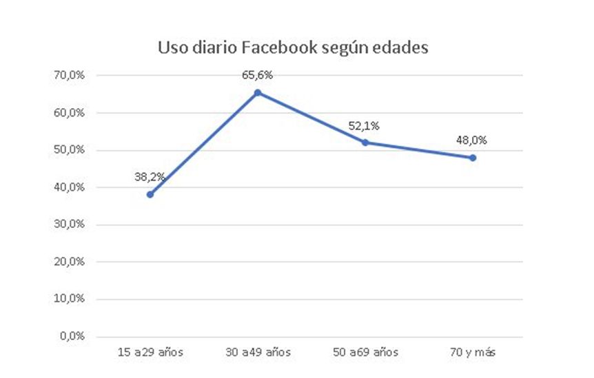 Como vemos es en el primer grupo de edades donde el uso diario de Facebook es menor, aunque la cifra es cercana al 39% de este grupo. En cambio en el segundo tramo de edades, entre los 30 y 49 años, Facebook tiene una presencia diaria muy contundente, entre estos usuarios la cifra llega a más del 65%. Otro dato para destacar tiene que ver con la cantidad de usuarios diarios mayores de 70 años, allí la cifra es del 48%, es decir, casi la mitad de los adultos mayores de 70 años utilizan diariamente Facebook.