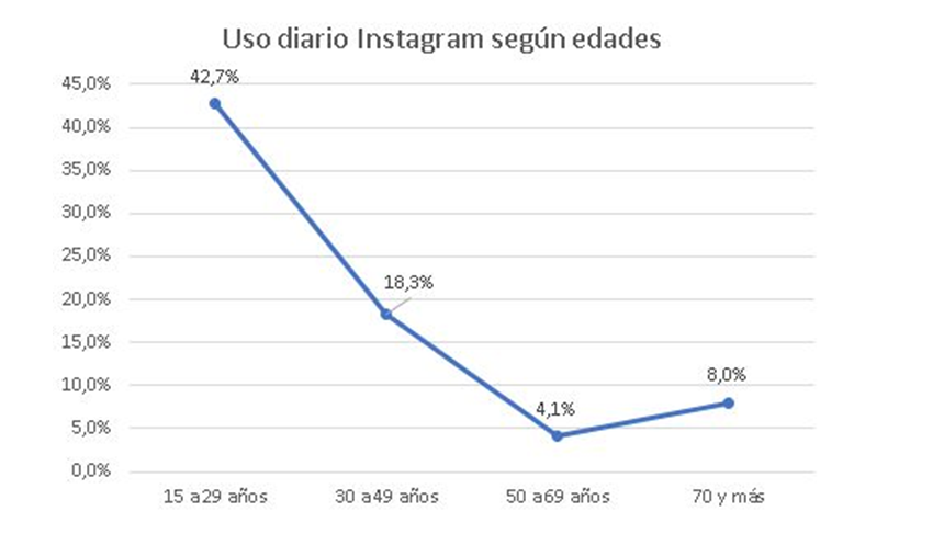 A diferencia de Facebook, la red social Instagram tiene su mayor grupo de usuarios diarios entre el primer grupo de edades, entre las personas entre los 15 y 29 años casi el 43% utiliza de forma diaria esta red social y como mínimo por 10 minutos al día. Sin embargo, a partir de la información recabada podemos afirmar que el tiempo de utilización diario de Instagram entre los más jóvenes es ampliamente superior al mínimo de los 10 minutos. Instagram tiene también otra particularidad, es utilizada también por los usuarios más jóvenes como un sistema de mensajería. Muchos de sus usuarios prefieren «comunicarse» a partir de esta plataforma en lugar de hacerlo por los canales más habituales como los mensajes, WhatsApp, Telegram, etc. Como vemos se trata de una red social donde los más jóvenes no sólo están, sino que además los usos que hacen de la misma son diversos.