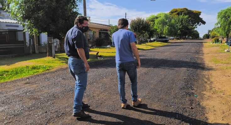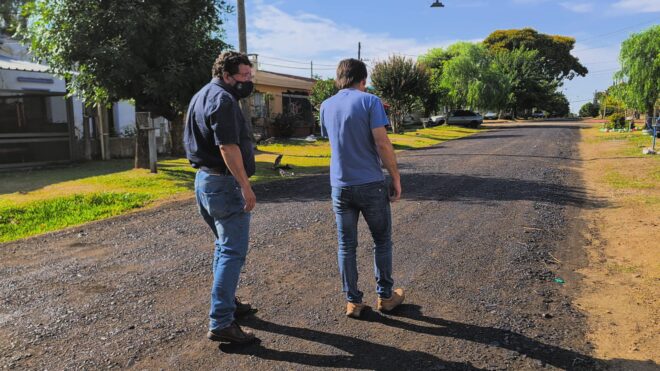 El intendente (i) de Salto, Gustavo Chiriff, y el director de Obras de la Intendencia, Elbio Machado, recorrieron las obras que se desarrollan en calle A. Invernizzi entre Bolivia y Maciel, donde se procede a aplicar tratamiento bituminoso.
