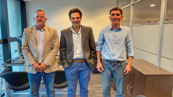 El director de Obras de la Intendencia de Salto, Álvaro Gómez, y el diputado Álvaro Lima fueron recibidos por José Manuel Arenas, responsable del área de Descentralización de la Oficina de Planeamiento y Presupuesto (OPP).