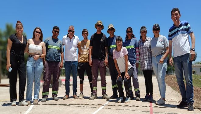 En pueblo Saucedo se está por inaugurar la cancha multiuso en un esfuerzo conjunto de funcionarios e integrantes del programa Oportunidad Laboral (Jornales Solidarios).