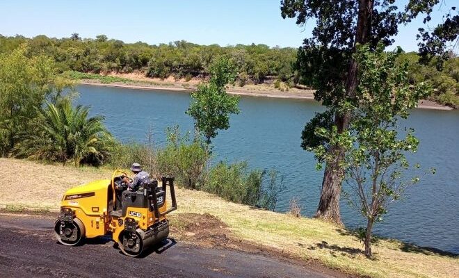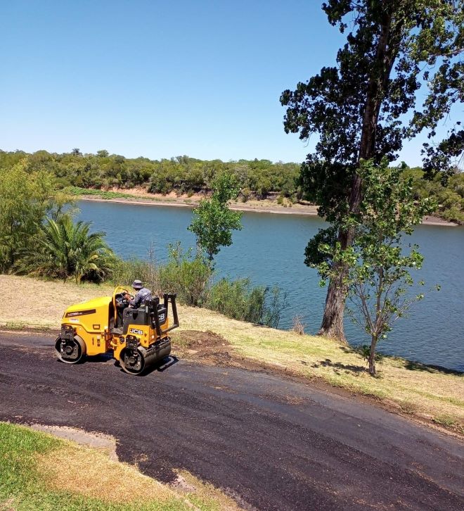 Funcionarios y maquinaria de la Intendencia de Salto trabajan en el mejoramiento de las calles internas del centro termal Termas del Arapey con bacheo, recapado y mejoramiento de la transitabilidad de las vías de transporte.