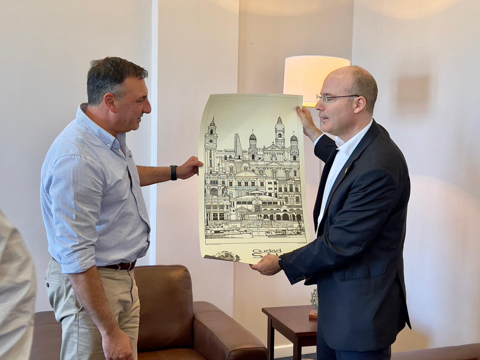 En el mediodía de este martes, el intendente de Salto, Carlos Albisu, recibió en su despacho la visita del embajador de Suiza en Uruguay, Álvaro Borghi.