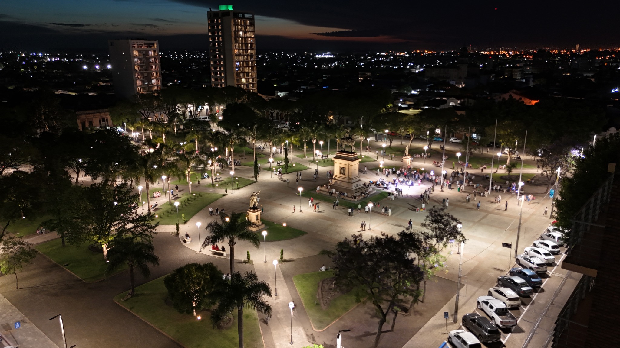 El coordinador de la Oficina Técnica del Departamento de Obras, Arq. Federico Villar, detalló las mejoras ejecutadas, que abarcan diferentes niveles de intervención. La primera etapa consistió en una reiluminación integral de la plaza, pasando de focos de 60 watts a nuevos artefactos de 100 watts, logrando una mayor amplitud y calidad lumínica. También se incorporó iluminación específica en la fuente, otorgándole un destaque especial, y se instaló iluminación peatonal en toda la circunvalación, colocada a cuatro metros de altura para reforzar la estética y la seguridad.