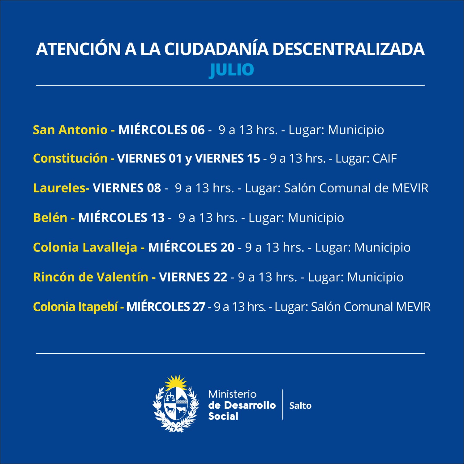 Itinerario de atención a la ciudadanía descentralizada del Mides Salto 4 julio, 2022 - Dejar un comentario