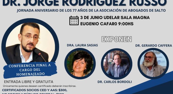 El Dr. Jorge Rodríguez Russo nació en Artigas, habiéndose trasladado a Salto para realizar sus estudios. Se recibió de Abogado y desde siempre ha estado vinculado a la Regional Norte de la Universidad de la República. El pasado año alcanzó el máximo grado académico como docente, siendo el primero que logra este hito de forma íntegra en la casa de estudios en Salto. Esto llevó a la determinación de que este año, la Asociación de Abogados de Salto resolviera homenajearlo a través de una jornada sobre derecho civil, su especialidad.
