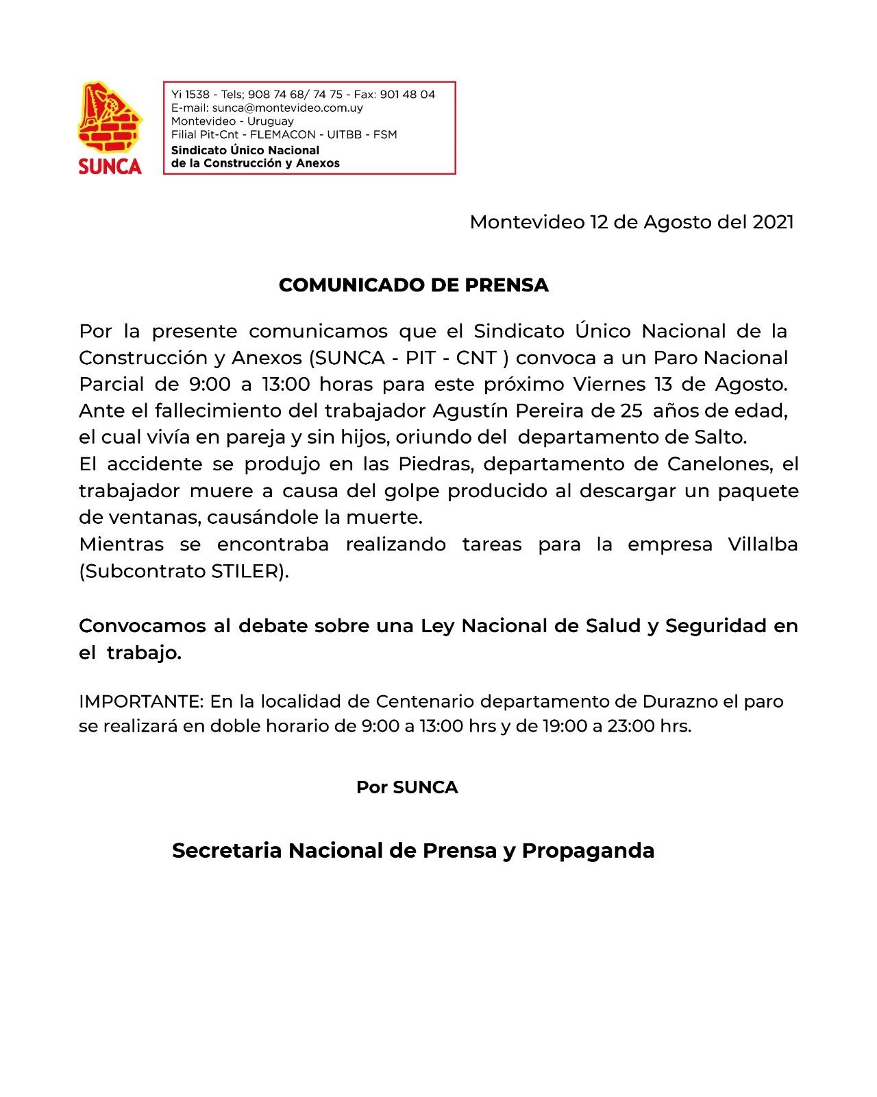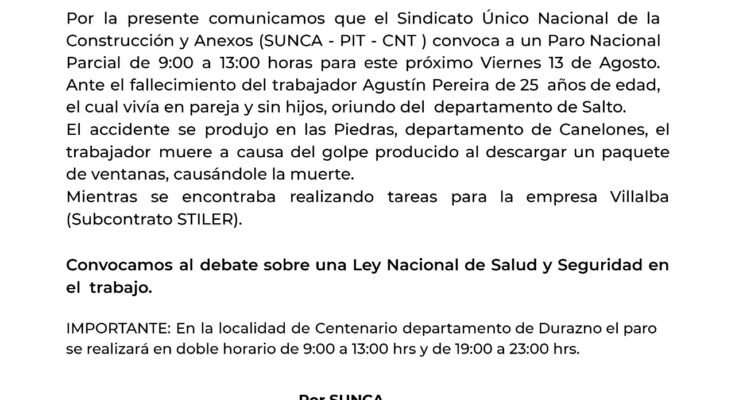 Según la información brindada por el Sindicato Único Nacional de la Construcción y Anexos (Sunca), Pereira “murió a causa del golpe producido al descargar un paquete de ventanas”.