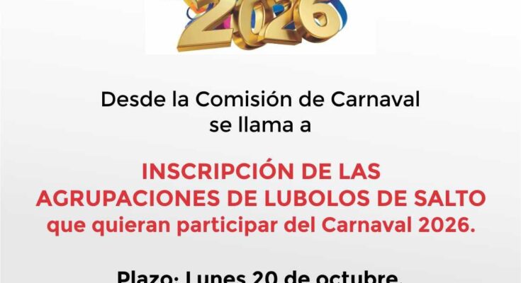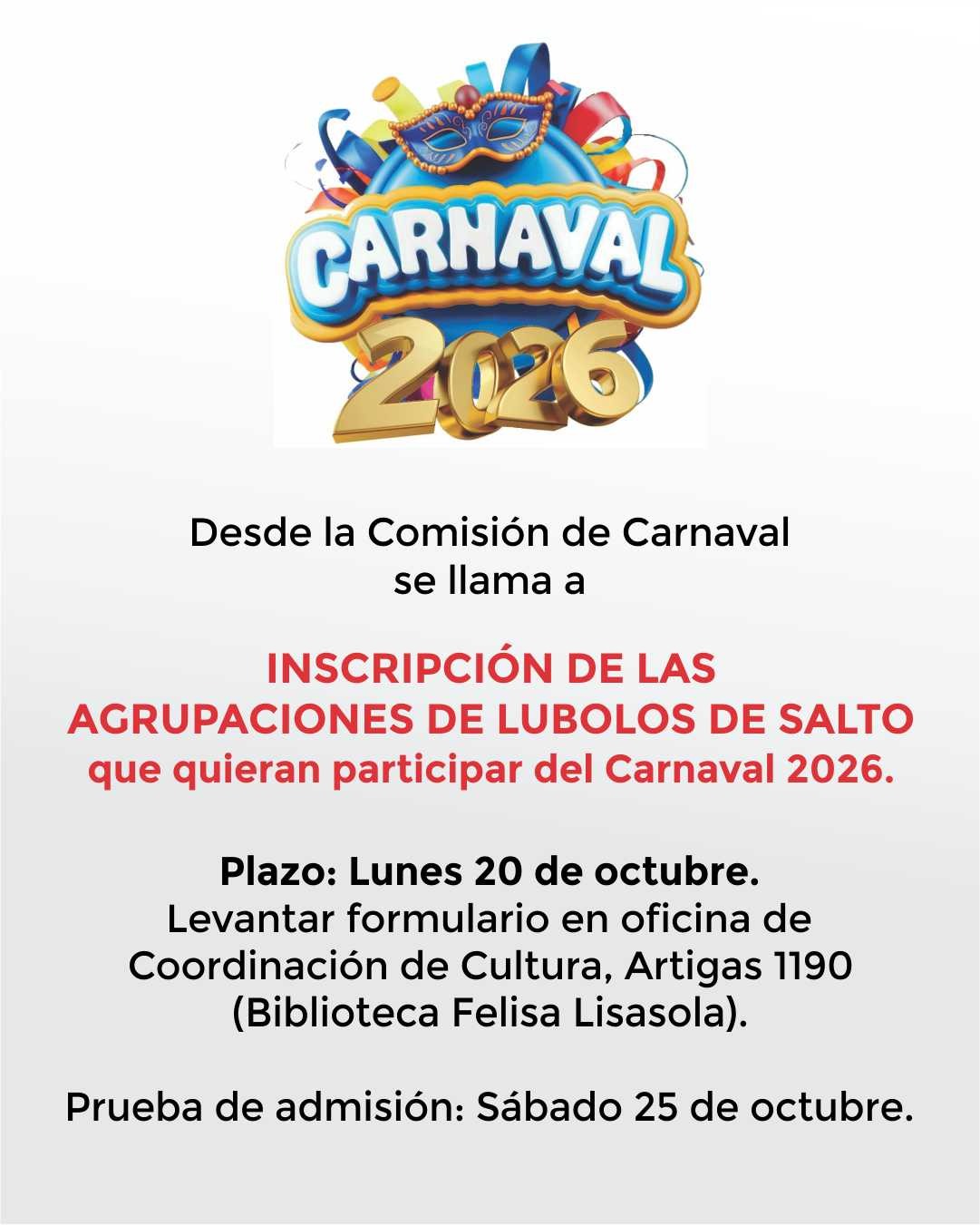 La Comisión de Carnaval del Gobierno de Salto convoca a las agrupaciones de Lubolos del departamento que deseen participar del Carnaval 2026 a inscribirse hasta el lunes 20 de octubre de 2025, mediante el formulario correspondiente, que podrá ser retirado y entregado posteriormente en la oficina de Coordinación de Cultura, ubicada en Artigas y 25 de Agosto (Biblioteca Felisa Lisasola).