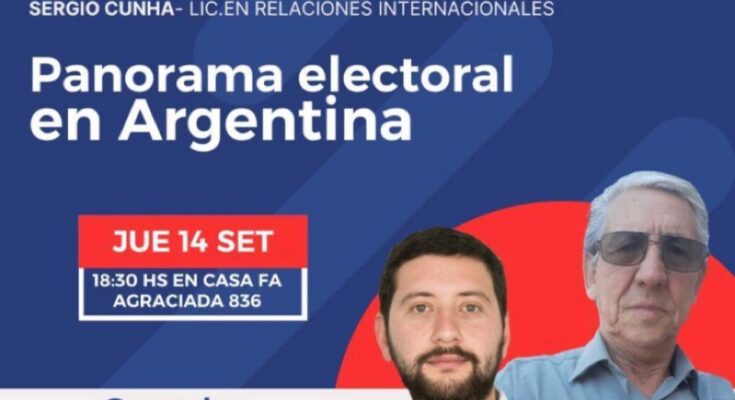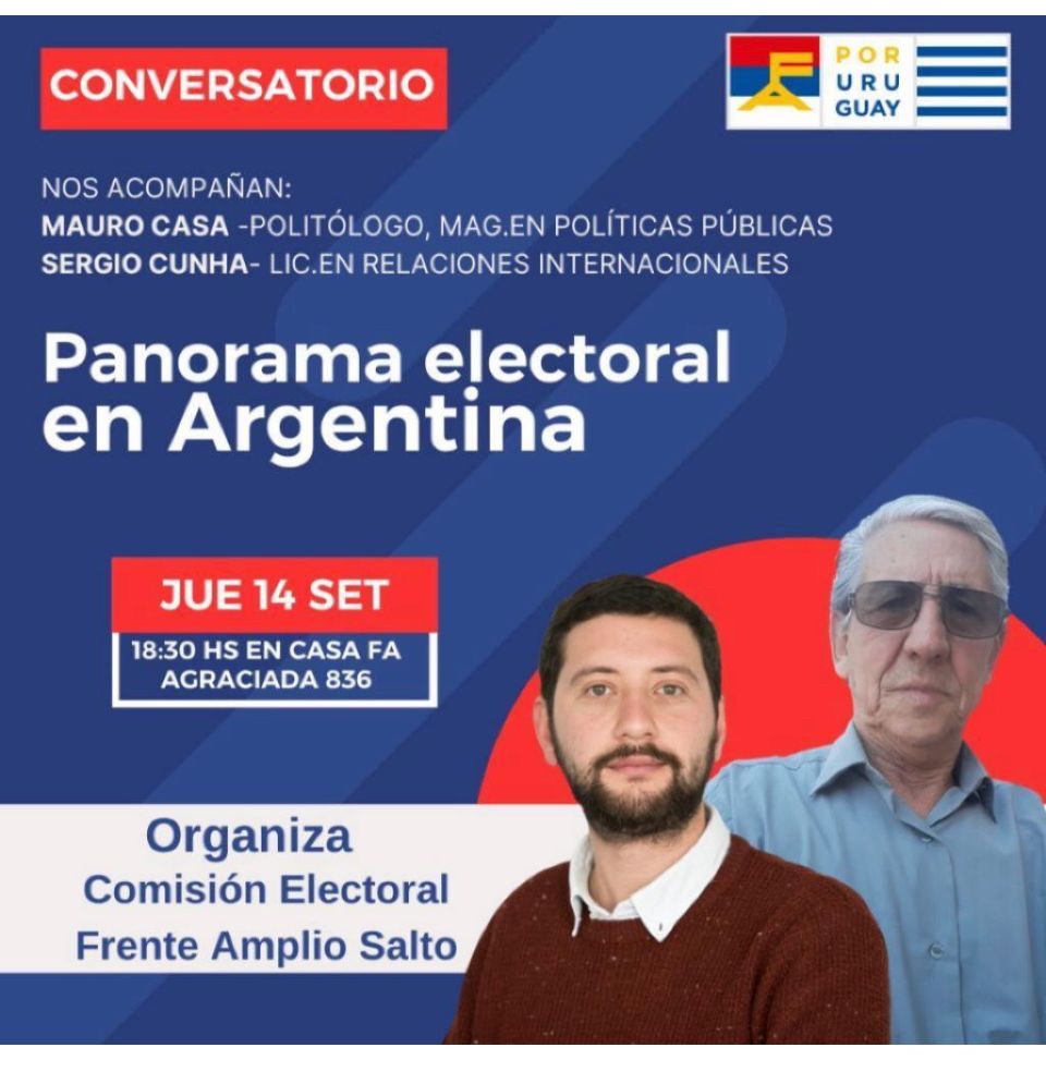 La Comisión Electoral del Frente Amplio Salto invita a la comunidad al Conversatorio «Panorama Electoral en Argentina». Este evento informativo y de reflexión se llevará a cabo el próximo jueves 14 de setiembre a las 18:30 horas en la Casa FA, ubicada en la calle Agraciada 836.