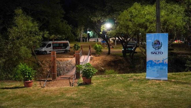 Con la presencia del intendente Andrés Lima, integrantes de su equipo de gobierno, ediles y el diputado Álvaro Lima, la Intendencia de Salto dejó habilitado el nuevo puente colgante en Costanera Norte. La estructura en madera y hierro fue construida en los talleres de Servicios Públicos a cargo de profesionales del área. Este proyecto fue concebido con el objetivo de sustituir la vieja y endeble estructura por otra más moderna, resistente y en armonía con el entorno. El puente facilita el tránsito peatonal entre el área de parrilleros y la zona de juegos infantiles contribuyendo a la seguridad de los transeúntes.