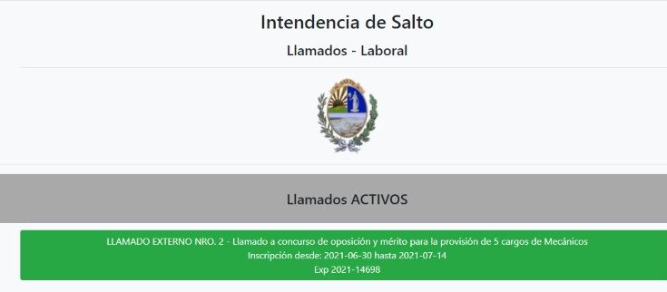 La Intendencia de Salto llama a concurso de oposición y mérito para la provisión de 5 cargos de mecánico. Los puestos comprenden específicamente 3 medio oficial mecánico, 1 mecánico electricista y 1 mecánico herrero.