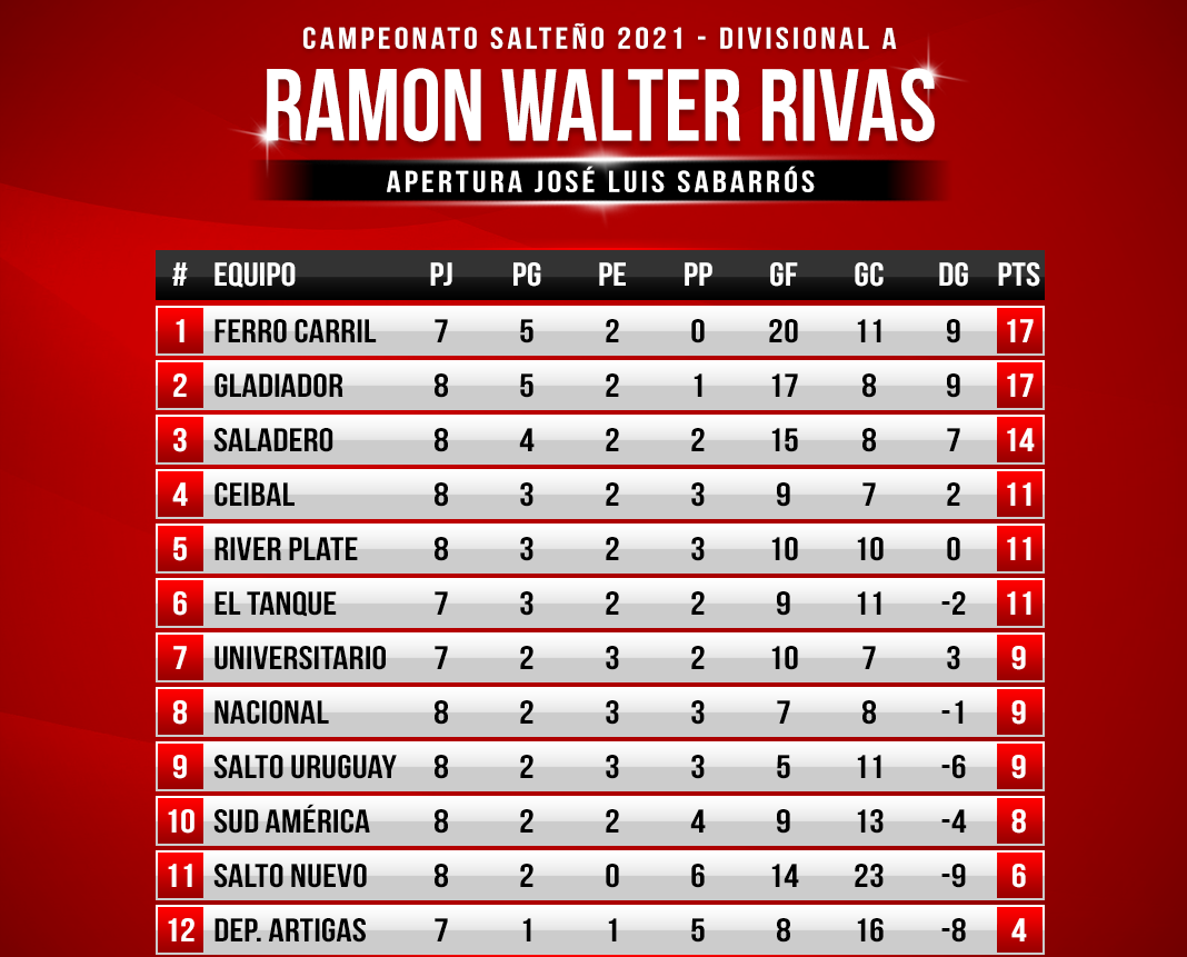 Es esta manera, Salto Nuevo pierde 6 puntos en la tabla de posiciones, mientras que El Tanque resta 1. En tanto, Ferro Carril y Deportivo Artigas ahora suman 3 unidades cada uno, al tiempo que Saladero aumenta 2.