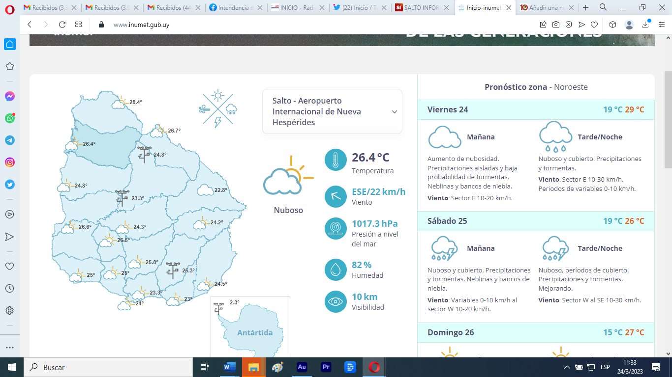 Desde el 24/3 en la noche y hasta la tarde el 25/3, se esperan lluvias y tormentas, algunas ocasionalmente fuertes. En zonas de tormentas fuertes se podrán registrar: lluvias intensas pasajeras, caída de granizo, actividad eléctrica, vientos fuertes.