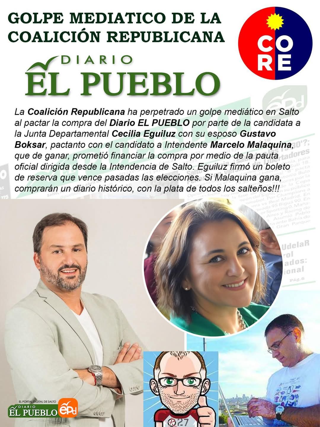 Hace días, desde una cuenta de WhatsApp se viene difundiendo una ‘’noticia’’ que me involucra en una supuesta compra del Diario El Pueblo. Desmiento categóricamente, no tuve, no tengo y no tendré ninguna intención de participar en este negocio entre privados. Aquí les dejo lo que con malicia, algunos han desparramado vía redes sociales, en nuestro departamento.