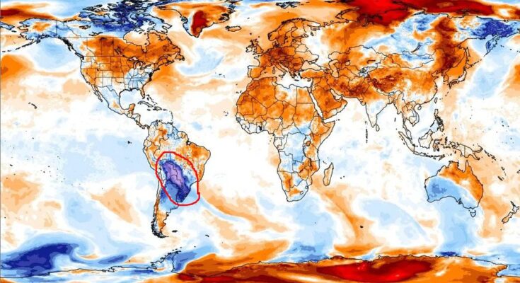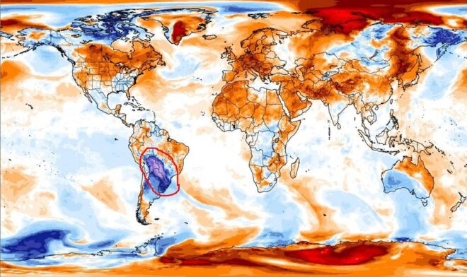 Una muestra de la intensidad fuera de lo común de este fenómeno está prevista para el lunes: los modelos indican que en ningún lugar del planeta la temperatura estará tan por debajo de su promedio de temperatura como en la zona afectada por la masa de aire polar de este frío antes mencionada, que incluye a Uruguay.