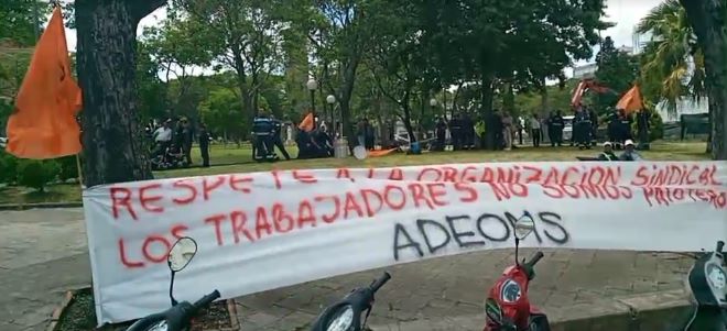 En la mañana de este lunes, dirigentes de Adeoms y funcionarios de Servicios Públicos y otras áreas, se manifestaron frente a la Intendencia de Salto, para mostrar su rechazo a las declaraciones del director Mario Furtado.