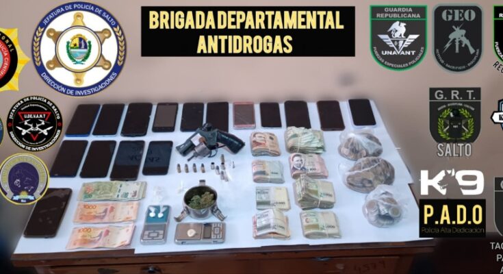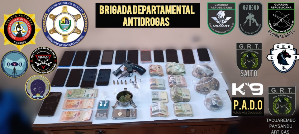 En el día de la fecha continuando con la investigación llevada adelante por parte de la Fiscalía Letrada de Tercer Turno con personal de la Brigada Departamental Antidrogas en el marco de la Operación Saturno, provisto de órdenes de allanamientos emitidas por Juzgado Penal de Cuarto Turno se realizaron 27 allanamientos en distintos barrios de la Ciudad de Salto siendo estos Caballero, Artigas, Malvasio, Progreso, Cerro, Almagro, Salto Nuevo, Ceibal y Patule, contando con la participación de mas de 250 efectivos de la Jefatura Policía de Salto conjuntamente con el apoyo de la Direccion Nacional Guardia Republicana, Unidad Nacional de Vehículos Aéreos No