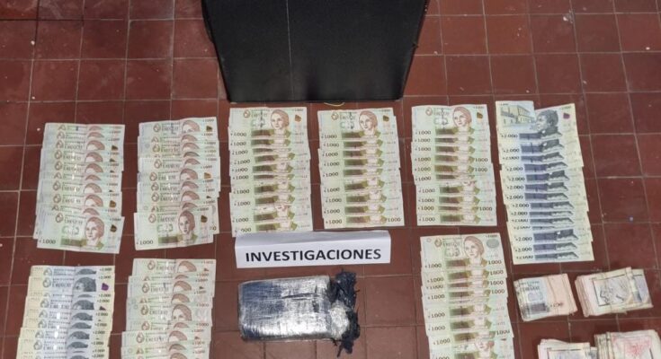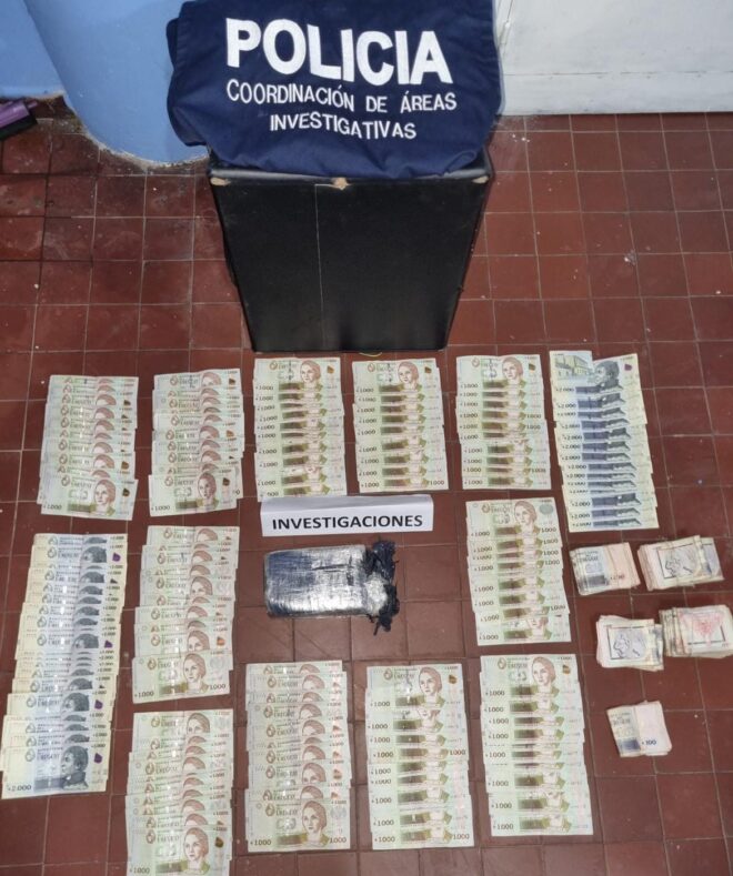 Se localiza en el interior del automóvil aproximadamente un kilo de sustancia amarillenta, (a determinar que tipo con prueba de campo, podría ser pasta base de cocaína) y la suma de $U 238.000 (Doscientos treinta y ocho mil pesos Uruguayos). Se continua trabajando.